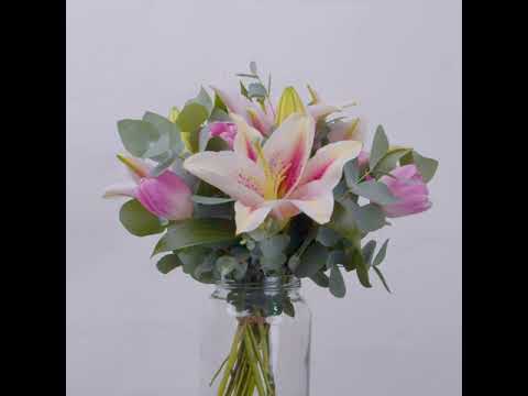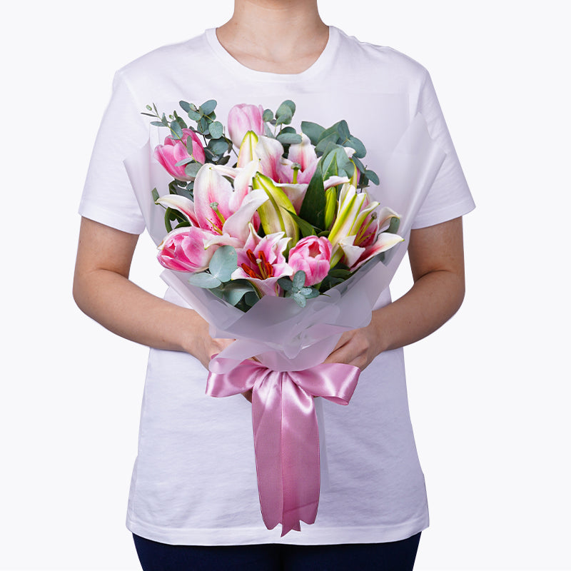 Pink Lily (2 Stalks), Pink Tulip (5 Stalks), Eucalyptus Leaves