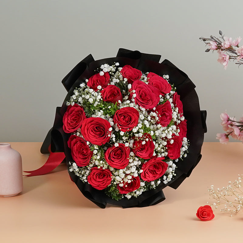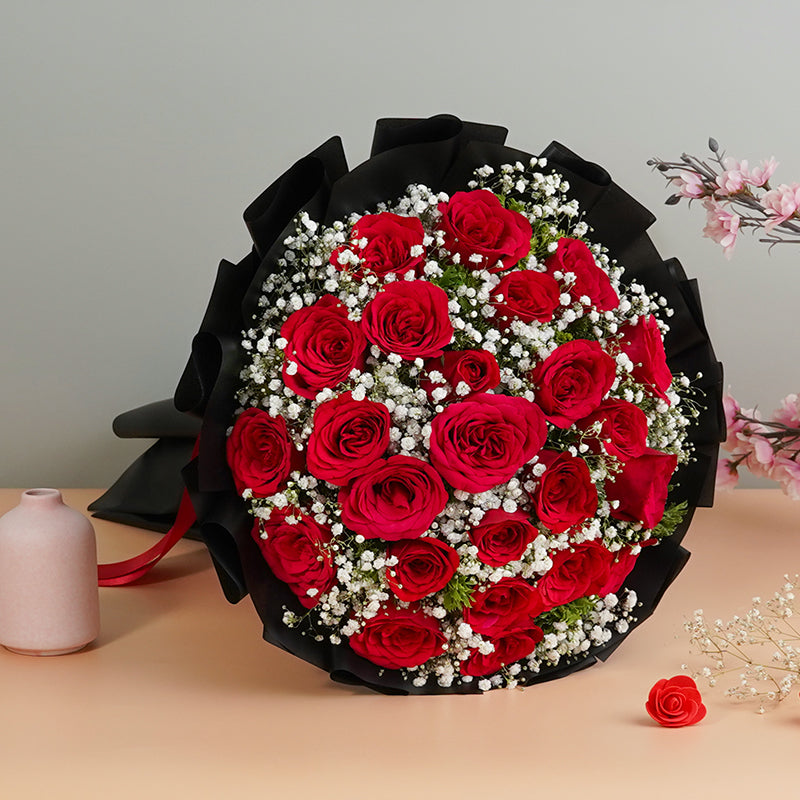 Red roses complimented by fine Baby Breaths (Gypsophila) makes this bouquet an absolute stunner! Elegantly wrapped, this bouquet is perfect for romantic occasions, birthdays or anniversaries as it represents your love and tenderness well. A bouquet that speaks for you!