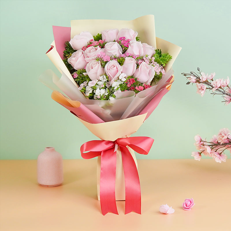 Take a walk in the moonlight with this lovely bouquet and share the moment with your loved one. 12 majestic roses, elegantly wrapped. The Pink rose stands for elegance and grace and symbolizes appreciation to the recipient.