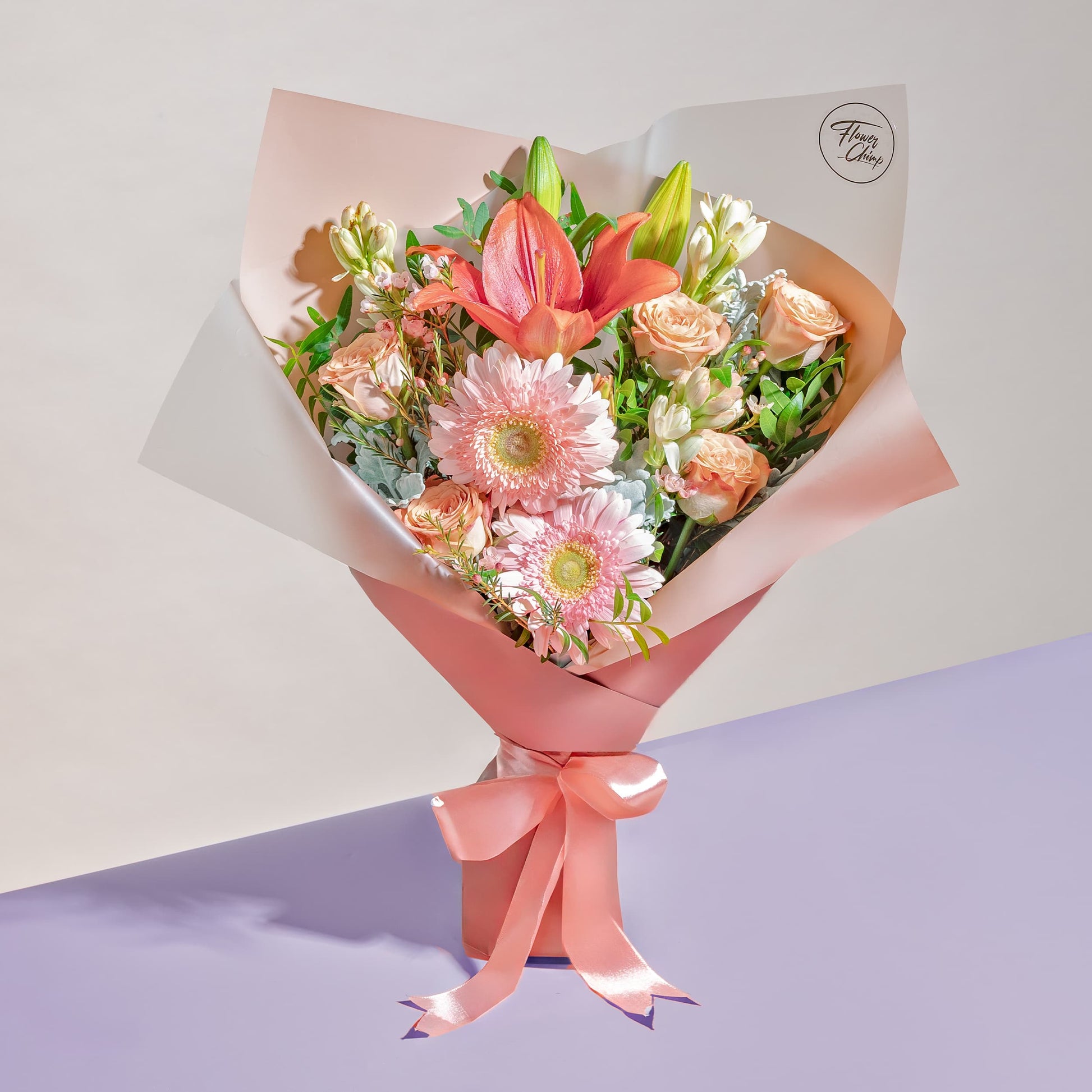 Orange Lily Tiger (2 Stalks), Light Pink Gerbera (2 Stalks), Cappuccino Rose (5 Stalks), White Tuberose (3 Stalks), Pink Wax Flower (1 Stalk), Green Pistacia (1 Stalk), Dusty Miller (2 Stalks)