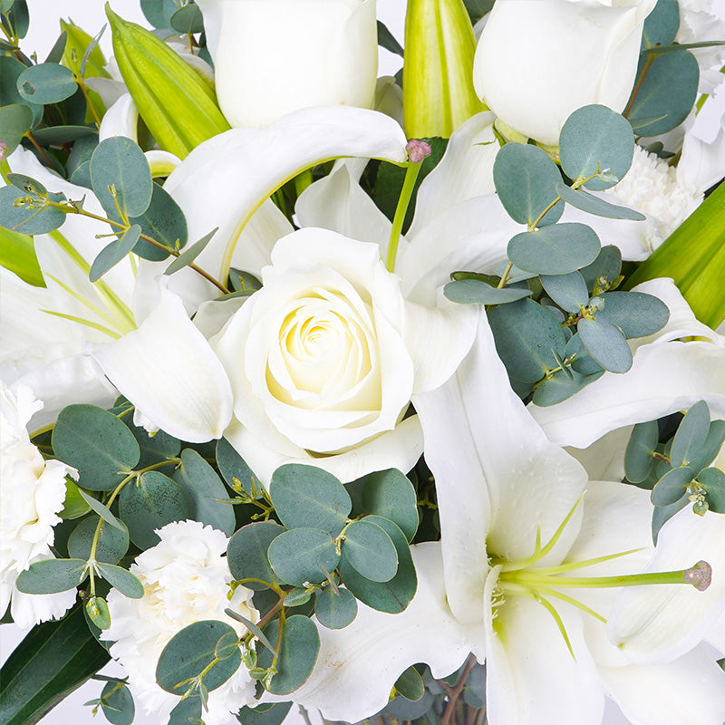 White Rose (5 Stalks), White Lily (3 Stalks), White Carnation (5 Stalks), Eucalyptus Leaves