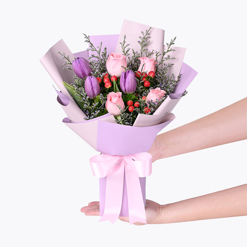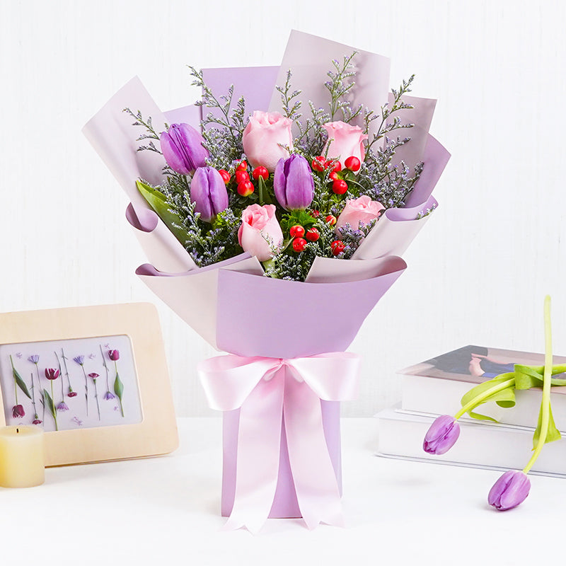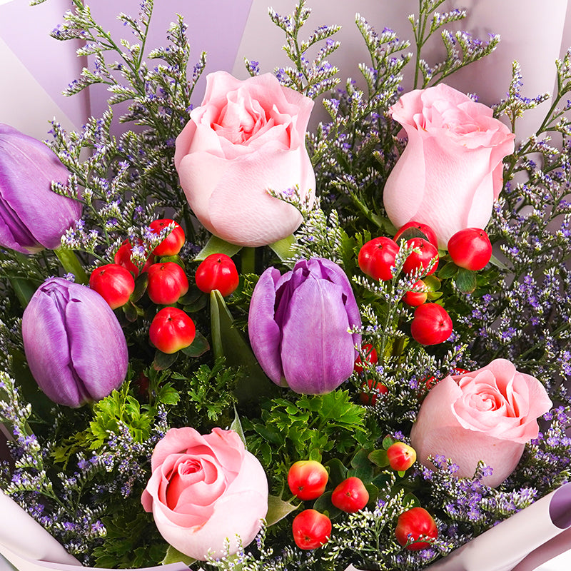 Purple Tulips (3 Stalks), Light Pink Roses (4 Stalks), Berries (1 Stalk), Misty Blue, Papua / Tea Leaf.
