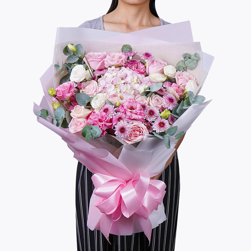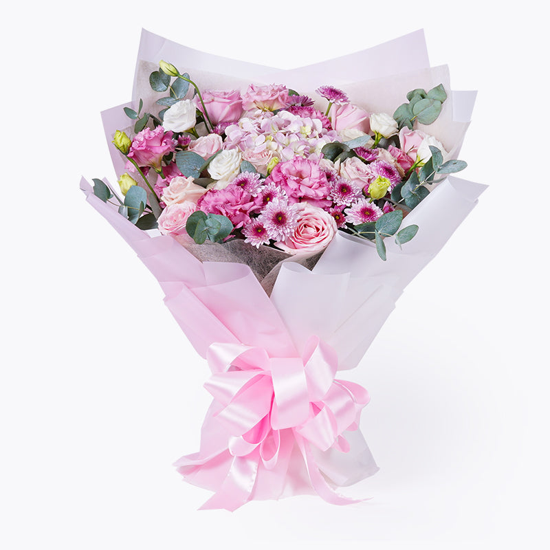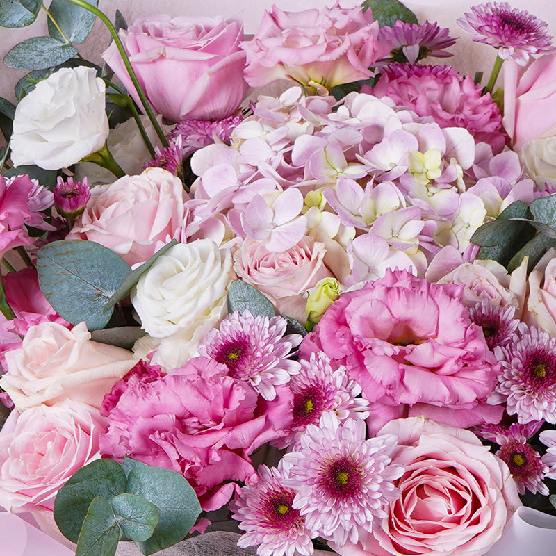 Pink Roses (10 Stalks), White Eustoma (5 Stalks), Two-toned Pink Button Pom (5 Stalks), Pink Hydrangea (1 Stalk), Pink Eustoma (5 Stalks), Eucalyptus Leaves (5 Stalks)