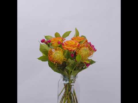 Orange Rose (3 Stalks), Orange Pincushion (2 Stalks), Red Berry (3 Stalks)