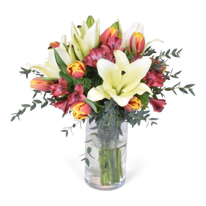 Brighten the room with this wonderful bouquet decked with 2-one yellow-orange tulips, red alstroemerias and yellow lilies. - Make your loved one smile the widest with this lovingly curated vase arrangement that represents your love or friendship.