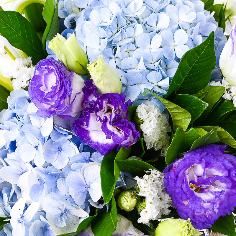 White Lily (1 Stalk), Light Blue Hydrangea (2 Stalks), Purple Eustoma (4 Stalks), White Statice