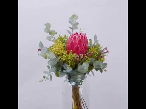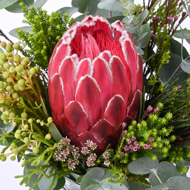 Red Queen Protea (1 Stalk), Green Huntemix, Eucalyptus Leaves
