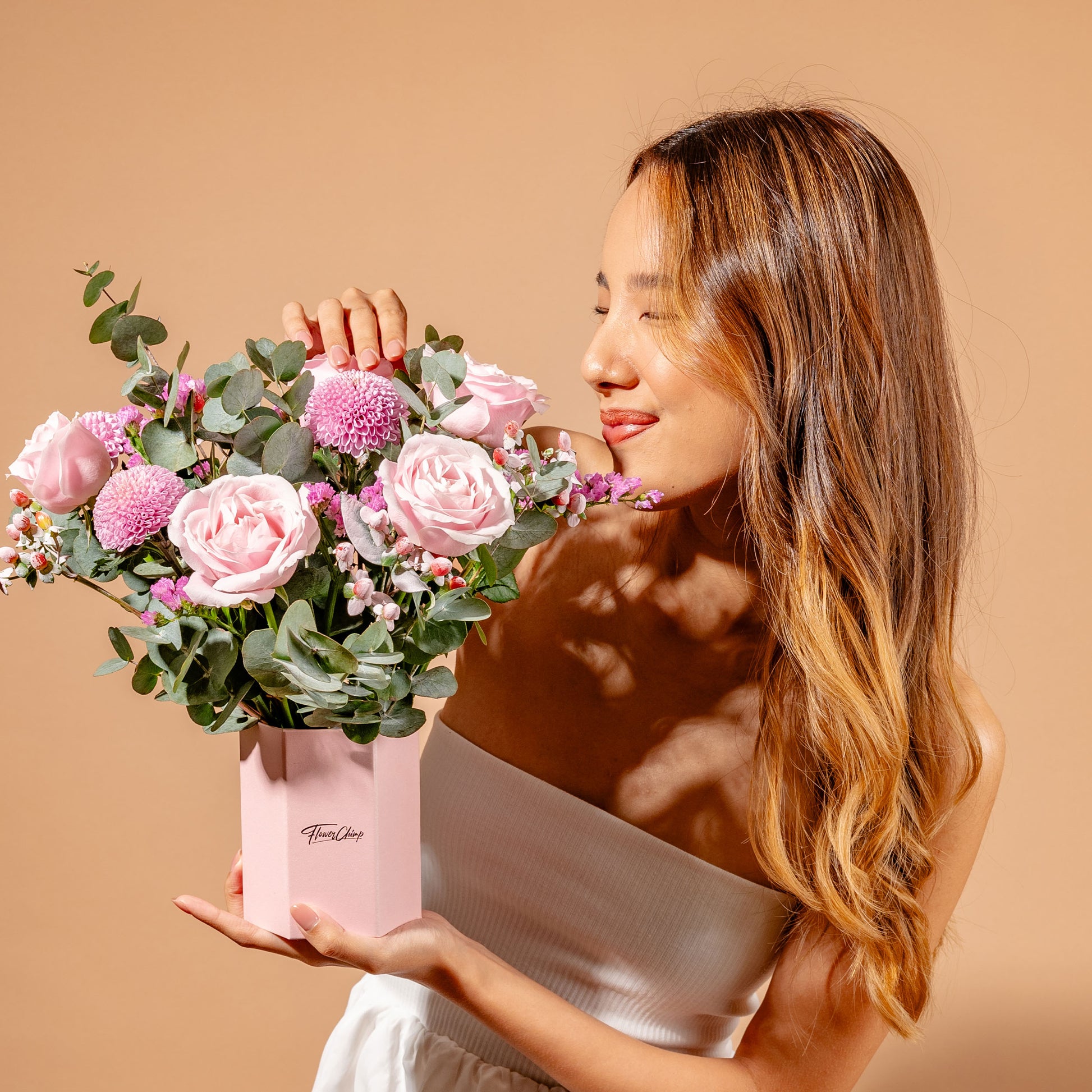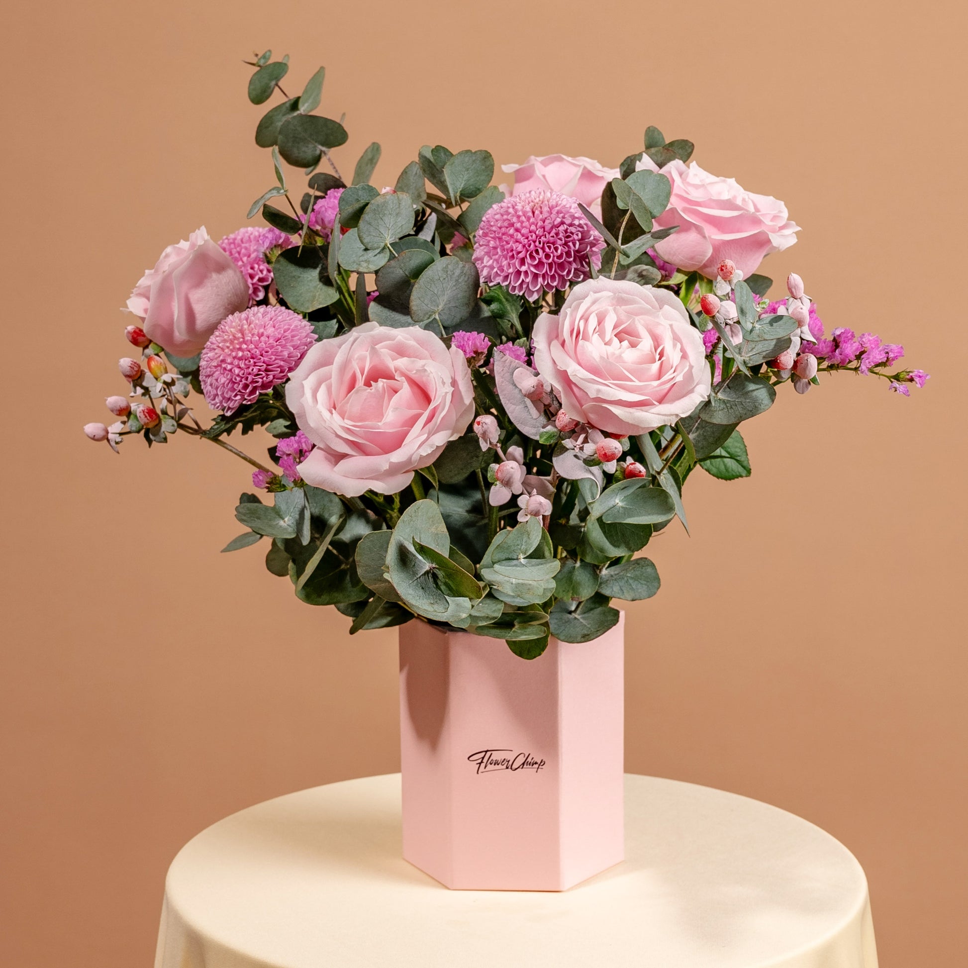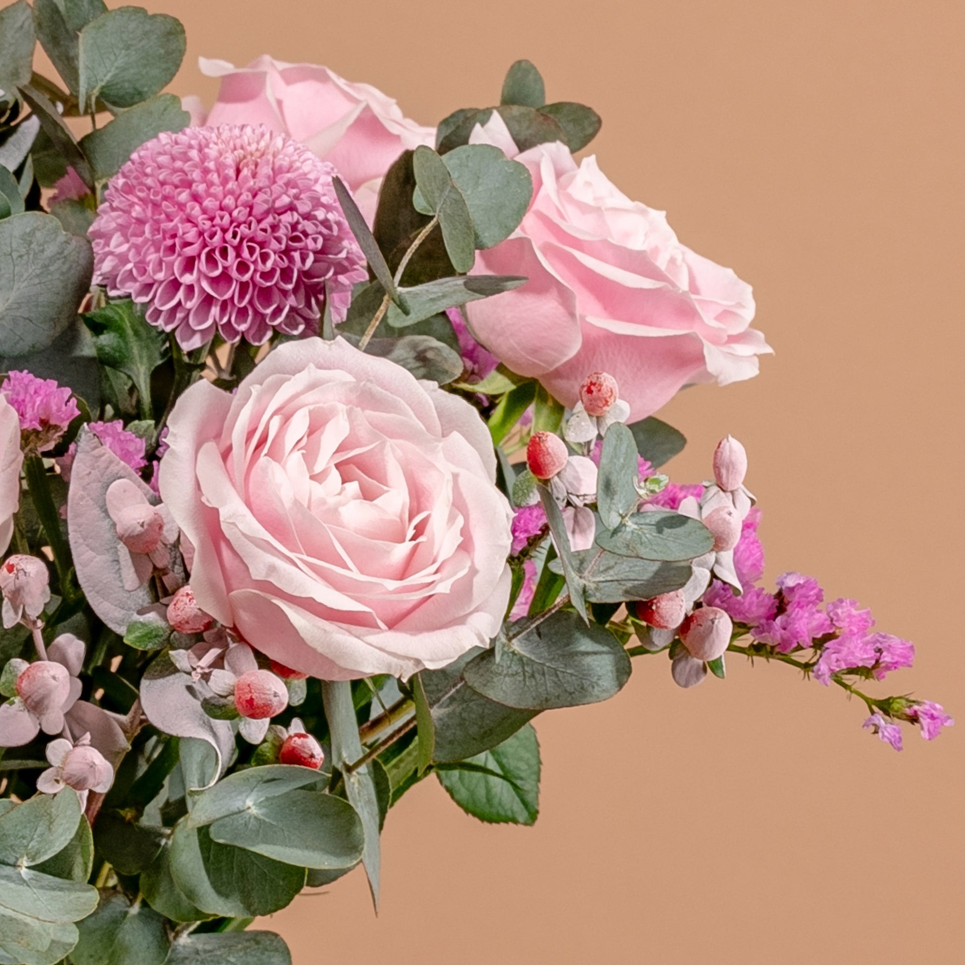 Pink Avalanche Rose (5 Stalks) , Light Purple Ping Pong (3 Stalks), Light Purple Statice (2 Stalks), Pink Berry (2 Stalks), Cinerea Eucalyptus