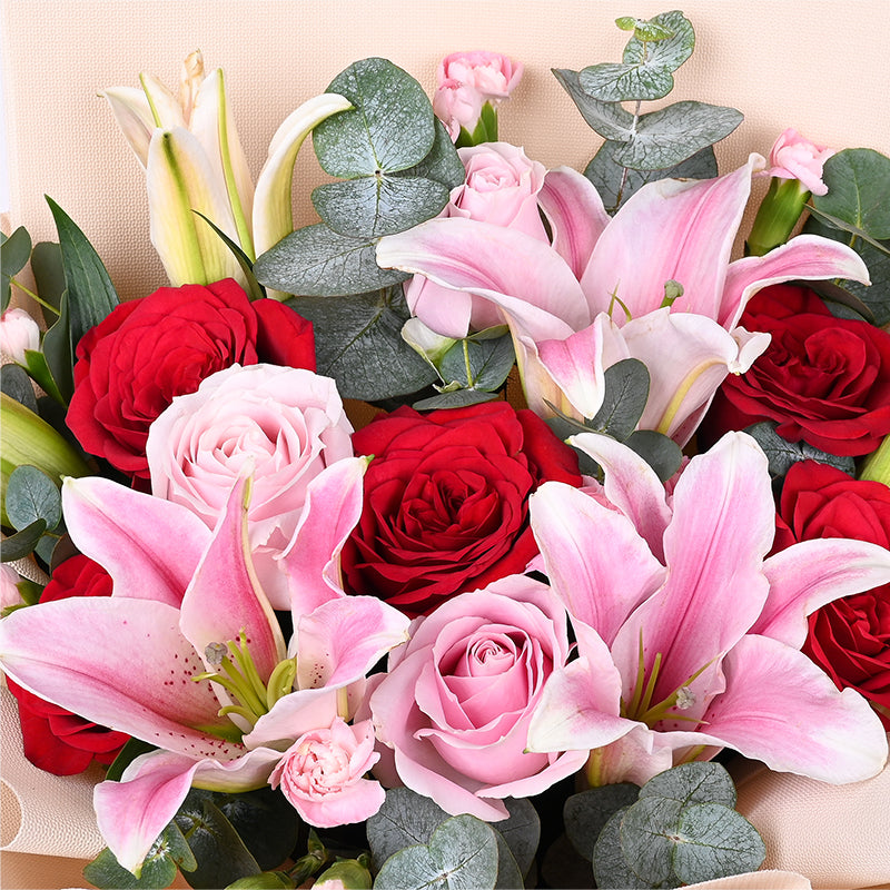 Red Roses (5 stalks), Pink Lily (2 Stalks), Pink Roses (3 Stalks), Pink Carnation Sprays (2 Stalks), Eucalyptus Leave
