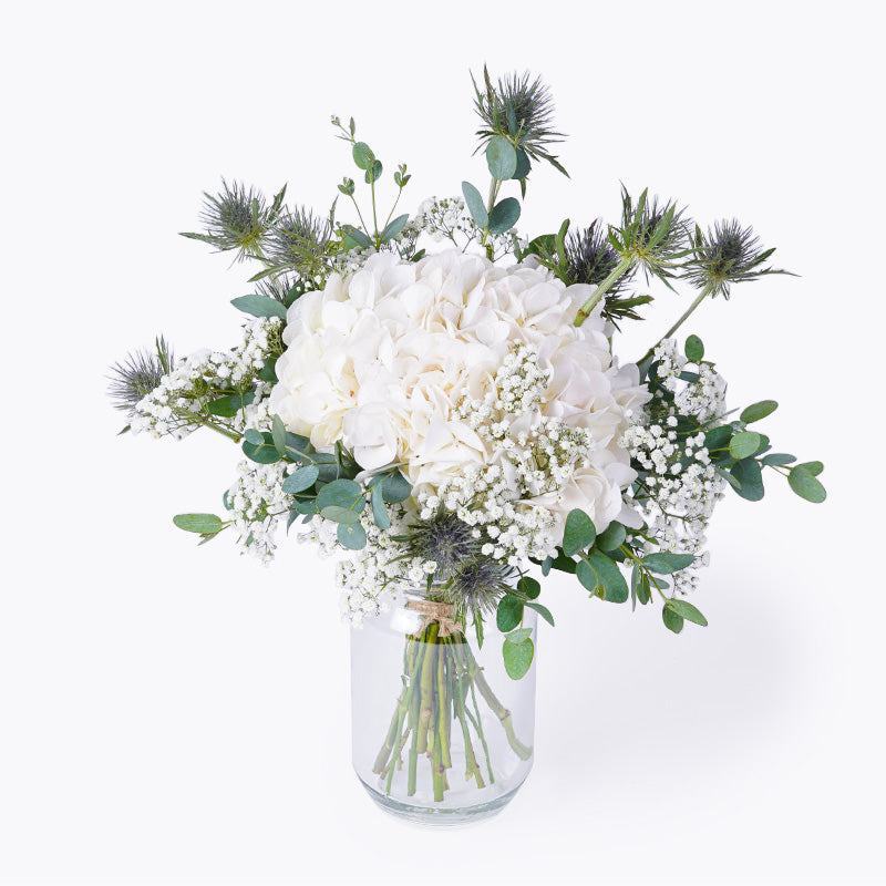 White Hydrangea (1 Stalk), Blue Eryngium, White Baby Breath, Eucalyptus Leaves
