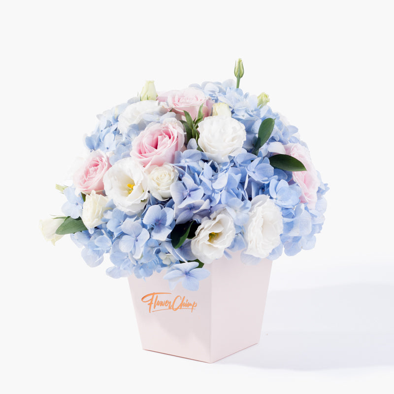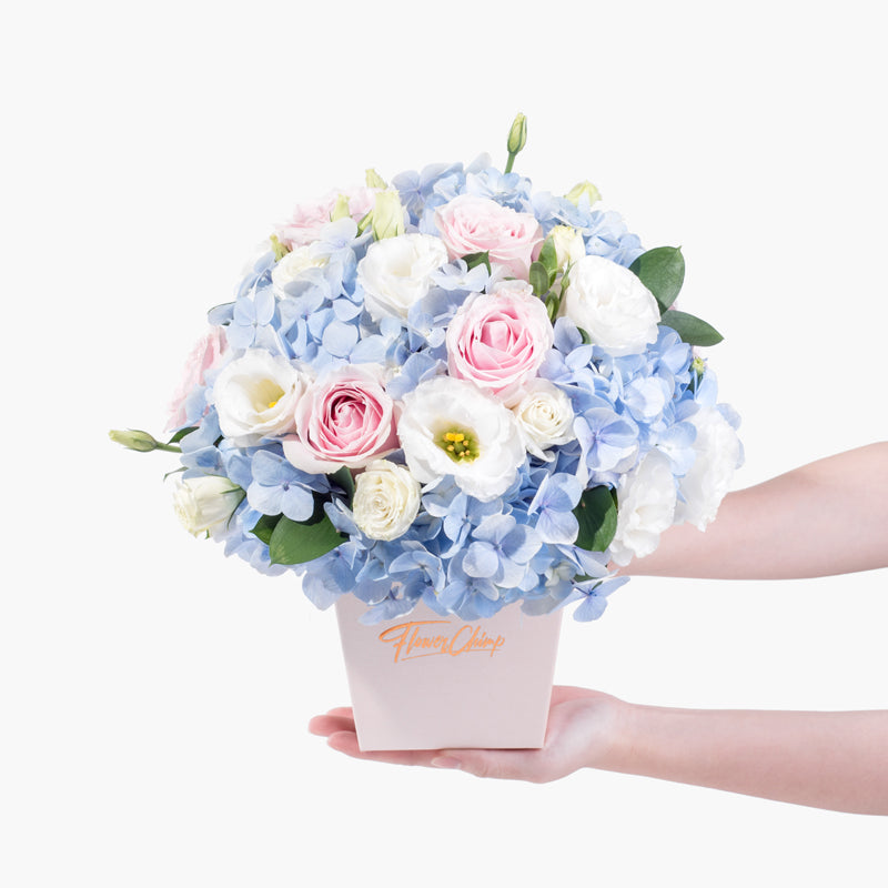 Pink Rose (8 Stalks), White Eustoma (3 Stalks), Light Blue Hydrangea (1 Stalk), Green Rucus