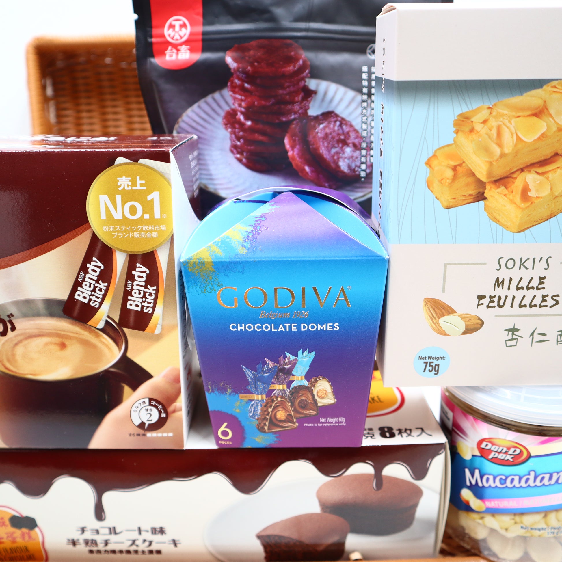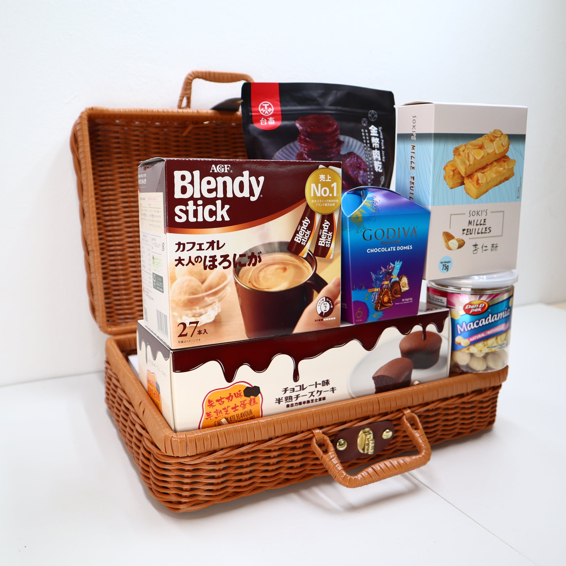 The perfect gift for any occasion. Whether it's a housewarming party or a special celebration, our gourmet hamper is sure to delight. Enjoy AGF Blend Stick Cafe Au Lait, Soki's Palmiers, Godiva Domes Assorted Chocolate, Dan D Pak Macadamia Nuts, Pando Chocolate Flavored Half Baked Cheese Cake, and T Ham Syrup Pork Jerky.