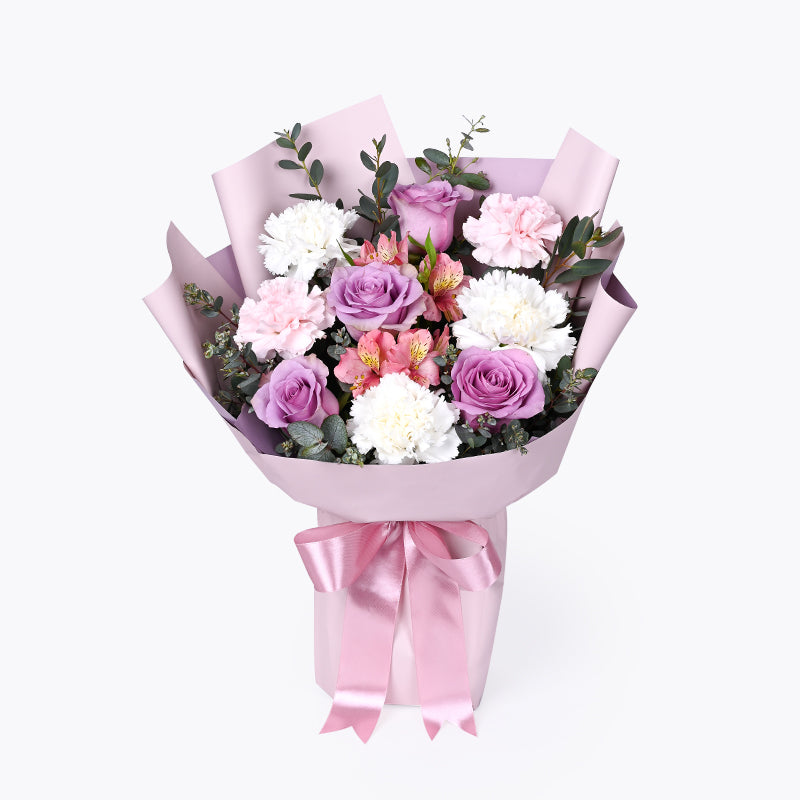White Carnation (3 Stalks), Pink Carnation (2 Stalks), Purple Roses (4 Stalks), Pink Alstroemeria (2 Stalks), Eucalyptus Leaves