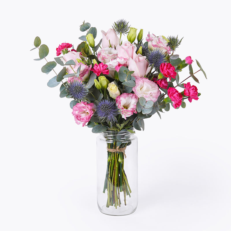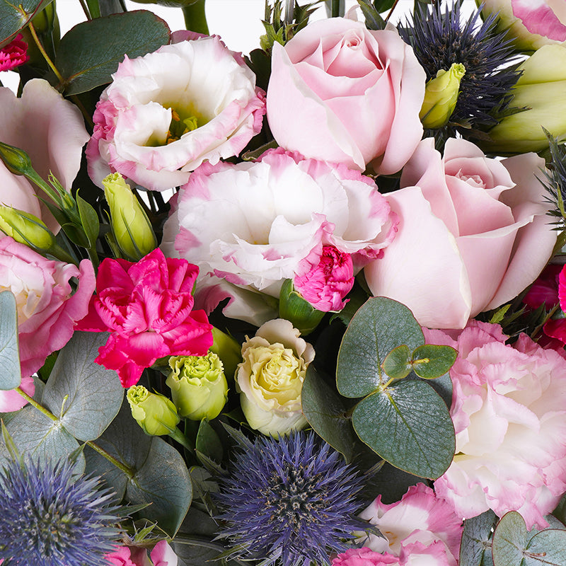 Pink Roses (4 Stalks), Two-toned Pink Eustoma (2 Stalks), Pink c (2 Stalks), Blue Eryngium, Eucalyptus Leaves