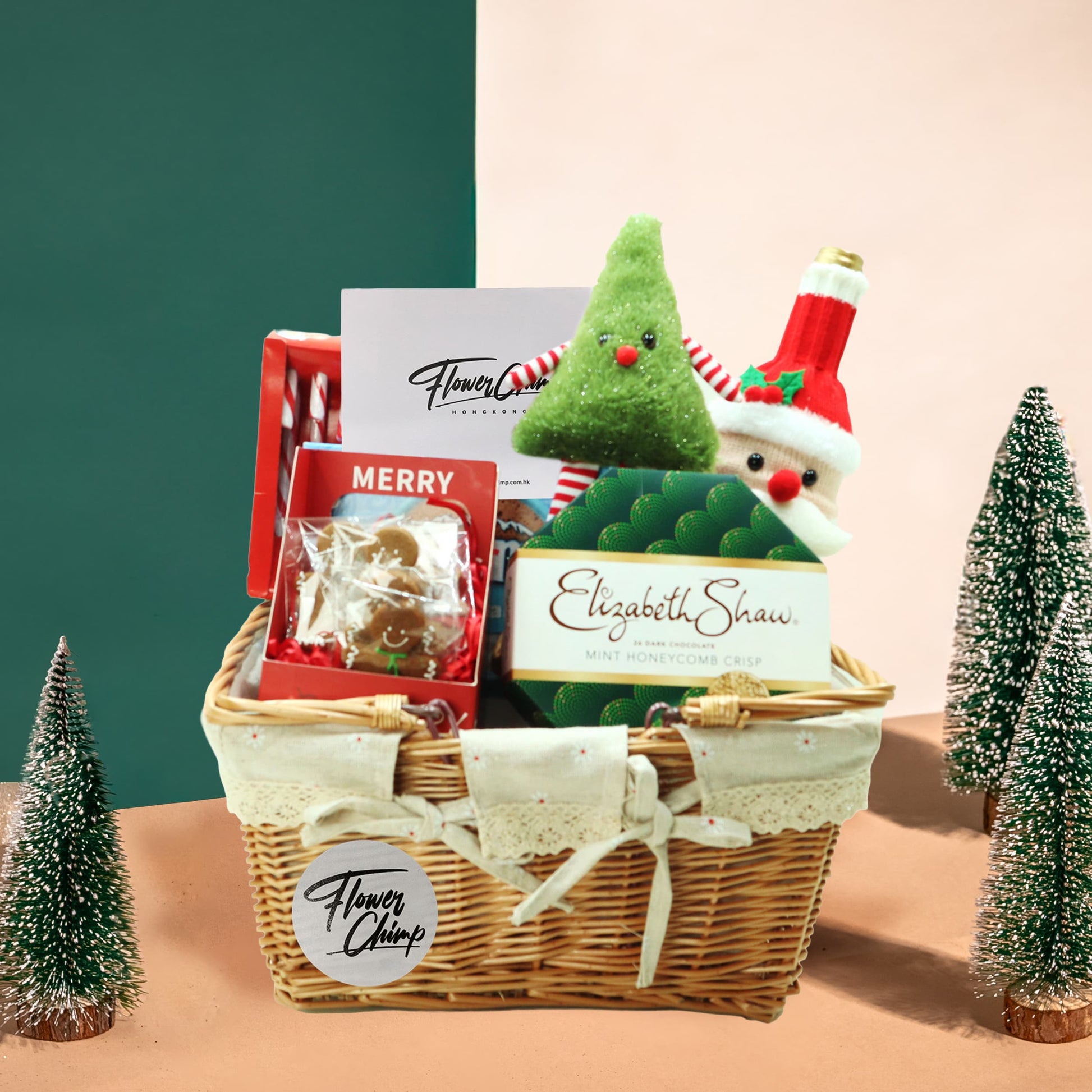 Unwrap the joy of the season with this festive bundle, where a Santa-shaped red wine winks from its spot beside a cheerful Christmas tree plush. Gingerbread man cookies, candy canes, and minty Elizabeth Shaw chocolates join in, filling every moment with cosy indulgence and a touch of holiday whimsy.