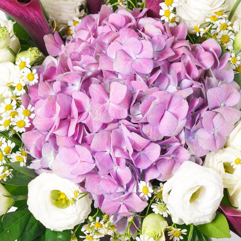 Purple Hydrangea (1 Stalk), White Eustoma (3 Stalks), Purple Calla Lilly (5 Stalks)