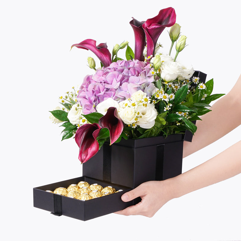 A flourishing arrangement so charming, you're sure to be left spellbound - our Illuminous Trinity Box; ornately decorated with purple calla lilies and hydrangeas, white eustomas, chamomile and murraya leaves. Illuminate the day with a flower arrangement so exsquisite that all your dreams could come true!