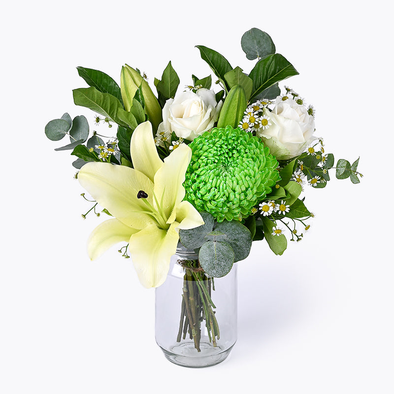 White Rose (2 Stalks), Yellow Lily (1 Stalk), Green Mum Net, White Chamomile, Eucalyptus Leaves