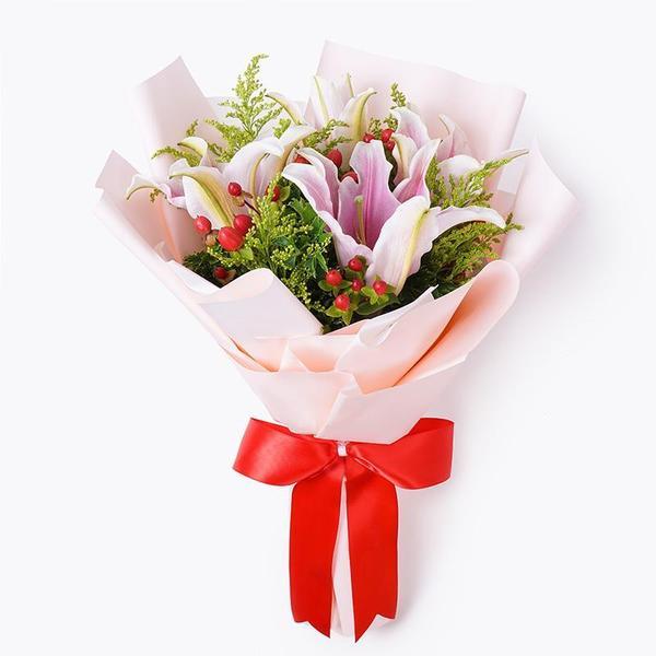 Beautiful pink lilies, decorated with red berries, peacock yellow, and tea leaves; our Lovely Lillian flower bouquet is a sweet gesture to make someone's day bright, blooming, and beautiful.