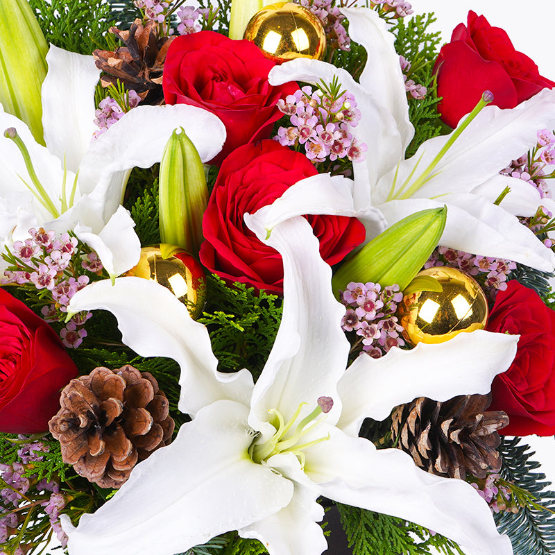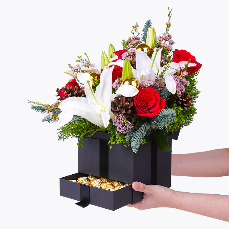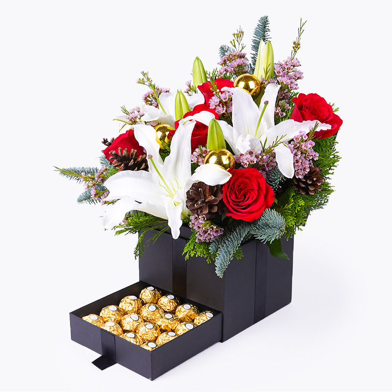 What could make your holiday moments more magical, than a marvellous arrangement of beautiful blooms and irresistible Ferrero Rochers? Our Magical Moments Trinity box - brimming with pristine lilies, roses, ornaments and pinecones, paired with decadent bites of chocolate - is truly a gift worth treasuring this holiday season.