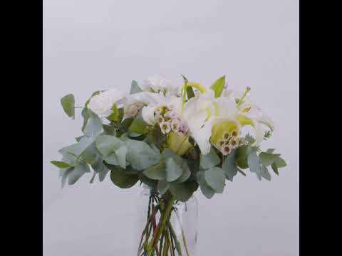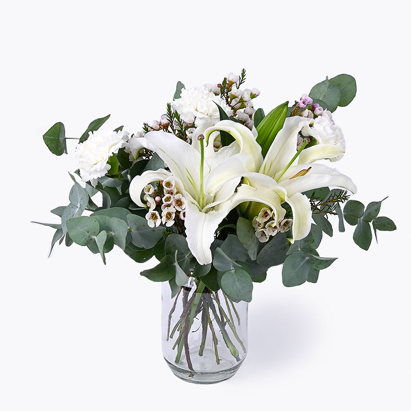 White Carnation (3 Stalk), White Lily (1 Stalk), White Wax Flower (3 Stalk), Eucalyptus Leaves