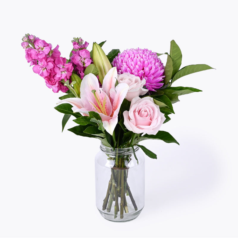 Maria Pink Rose (2 Stalks), Pink Lily (1 Stalk), Pink Mum Net (1 Stalk), Dark Pink Matthiolas (2 Stalks)