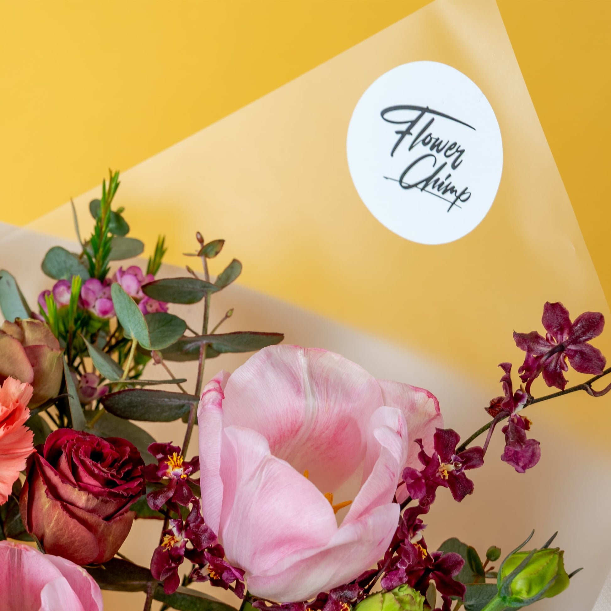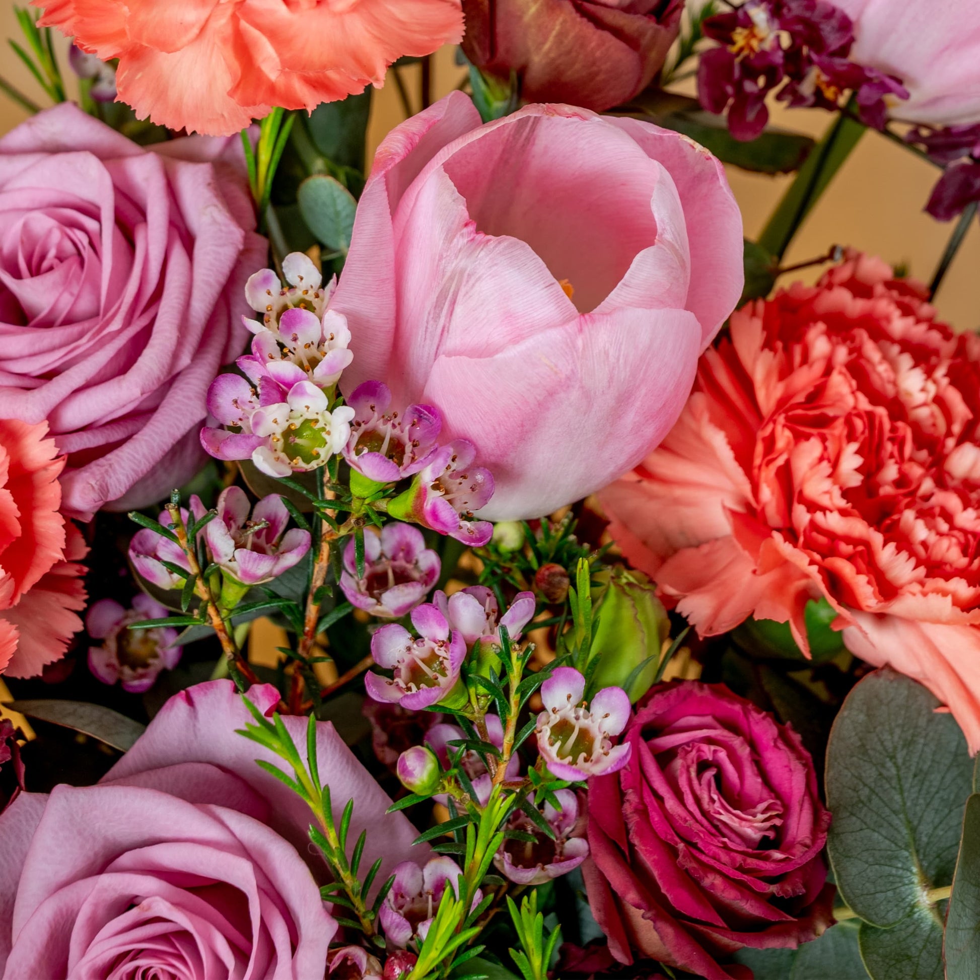 This gorgeous Mother's Day bouquet leads with sweet pink tulips and light orange carnations, their gentle warmth setting a tone that is tender and quietly radiant. Purple roses bring a sophisticated depth, while plum eustoma deepens the arrangement with a rich, velvety fullness that feels as layered as the love it represents. Wrapped in lilac pastel ivory with complementary foliage and finishing blooms, Reverie arrives like a moment worth remembering.