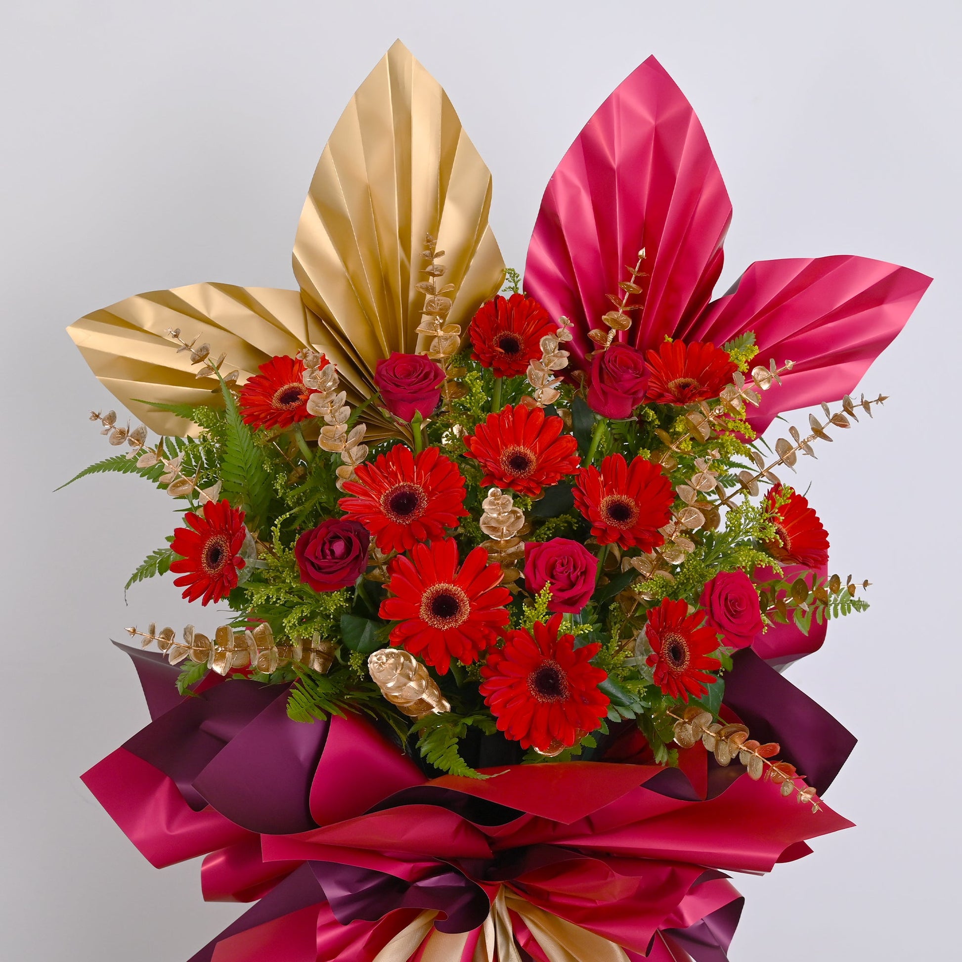 Red Gerbera (10 Stalks), Red Rose (8 Stalks), Yellow Peacock, Gold Artificial Eucaplutus Leaves, Gold Paper Fan, Paku Leaf