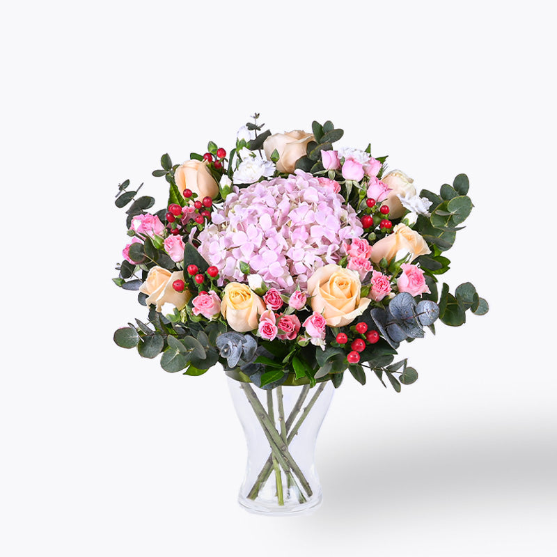 No matter if it’s for home or as a gift, our Sierra flower arrangement will surely impress! Contained in an elegant vase are stalks of beautiful flowers that exude warmth, such as light pink hydrangeas, champagne roses and light pink spray roses.