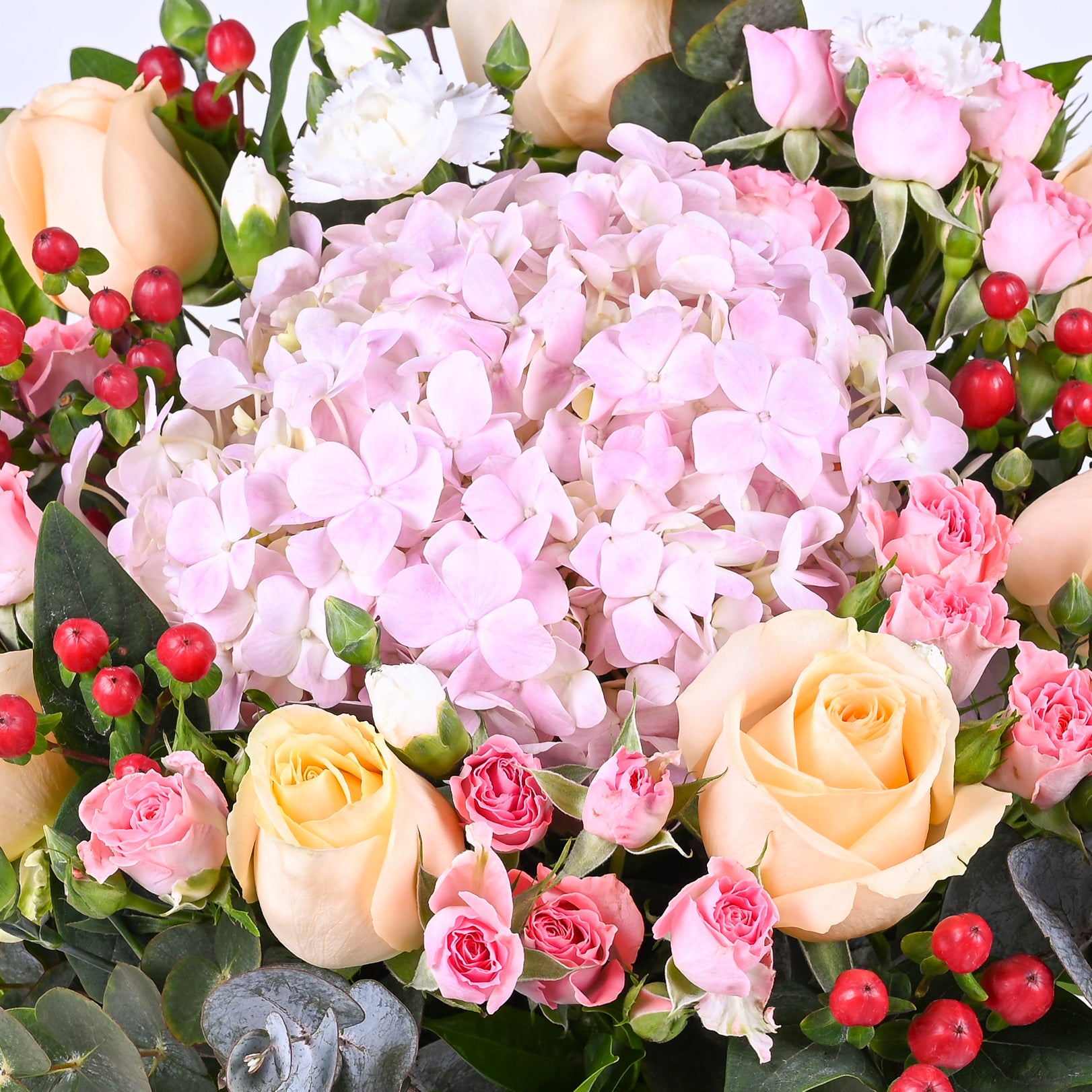 Champagne Rose (7 Stalks), Light Pink Hydrangea (1 Stalk), Light Pink Rose Spray (3 Stalks), White Spray Carnation (2 Stalks), Red Berry (1 Stalk), Eucalyptus Leaves
