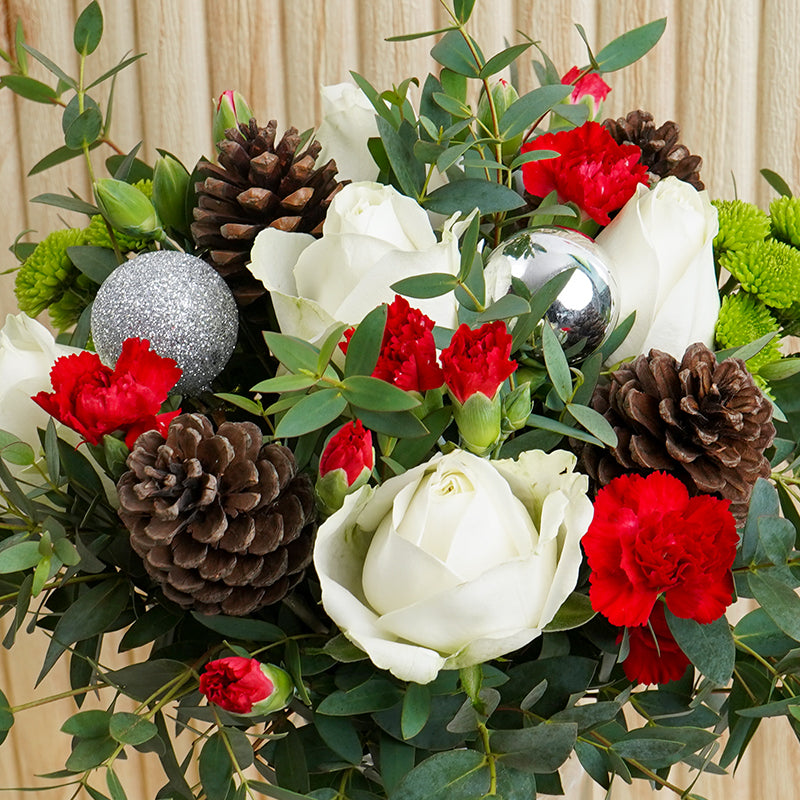 Snowy white roses and sprays of gorgeous red carnation flowers, decorated with festive pine cones and glimmering silver ornaments. Our Sleighbell flower vase is an arrangement that encapsulates the spirit of a white Christmas, truly the perfect gift for a holiday home!