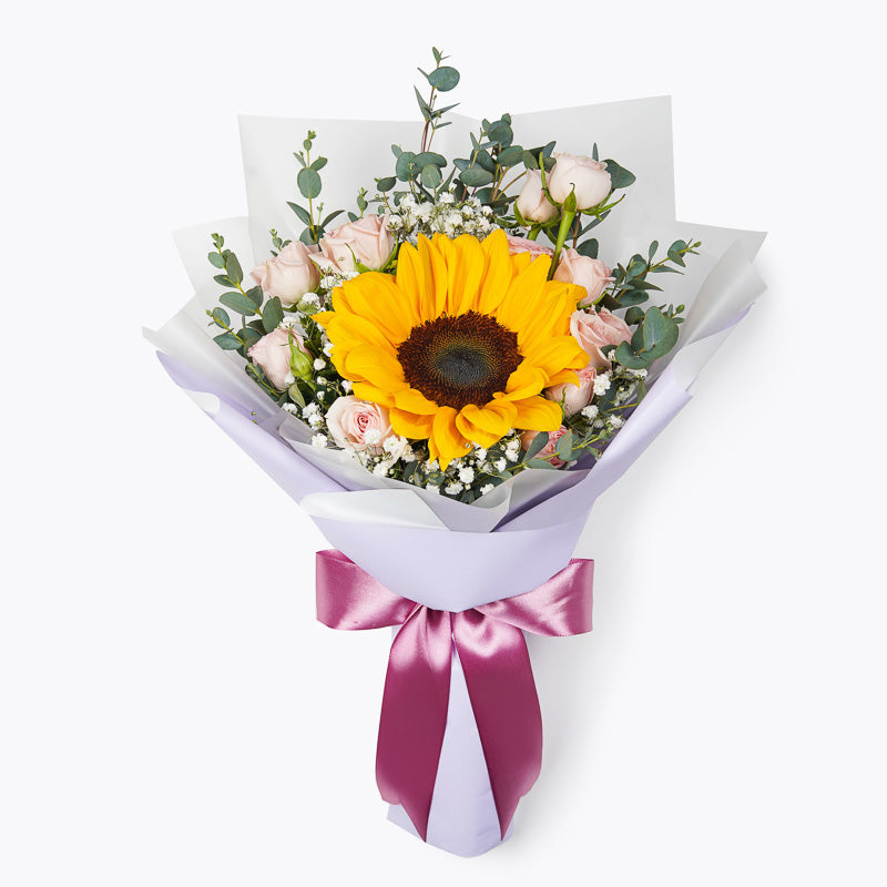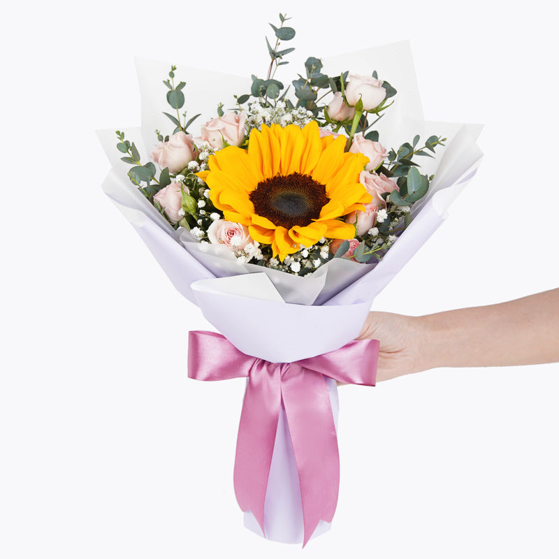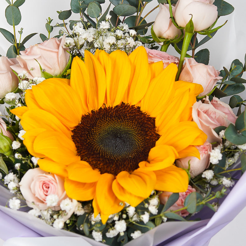 Let that special person know just how much brighter they make your life with our Sunshine mini bouquet! A gorgeous arrangement of spray pink roses, baby's breath with a bright and beautiful sunflower - this petite bouquet is the perfect way to let that special someone know they're the sunshine of your life.