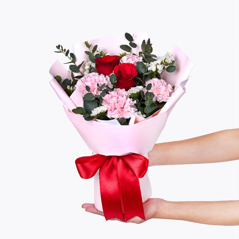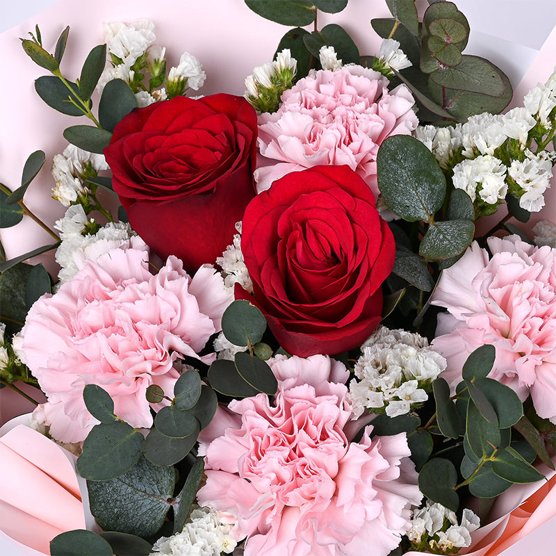 Pink Carnation (4 Stalks), Red Roses (2 Stalks), White Statice (2 Stalks), Eucalyptus Leaves