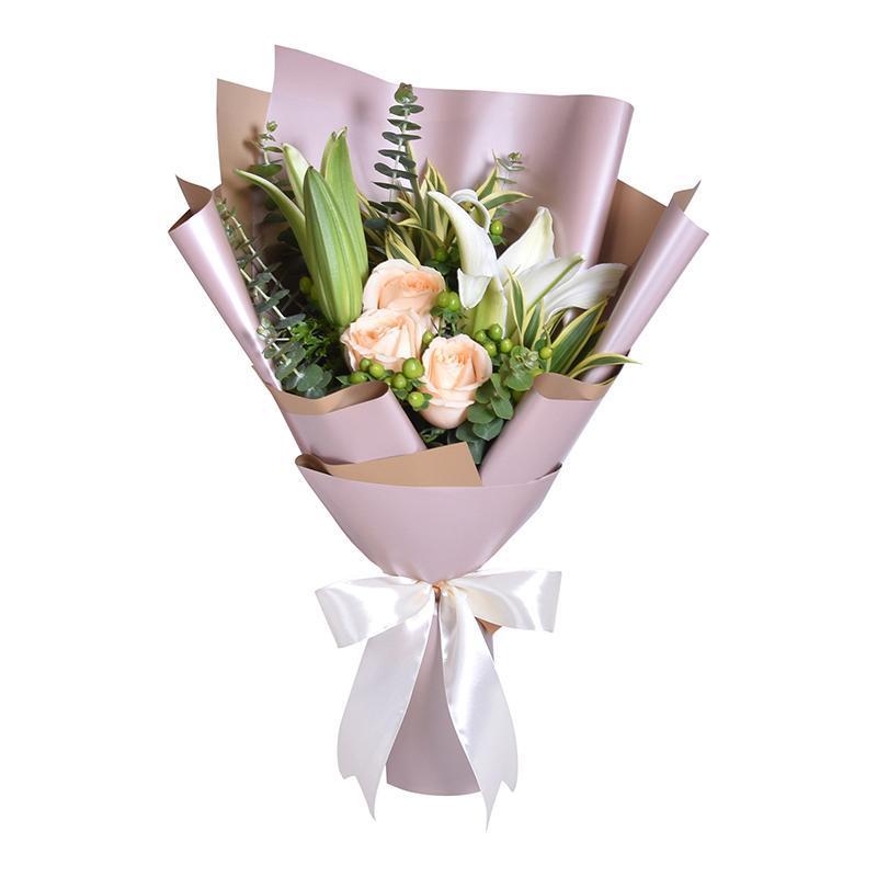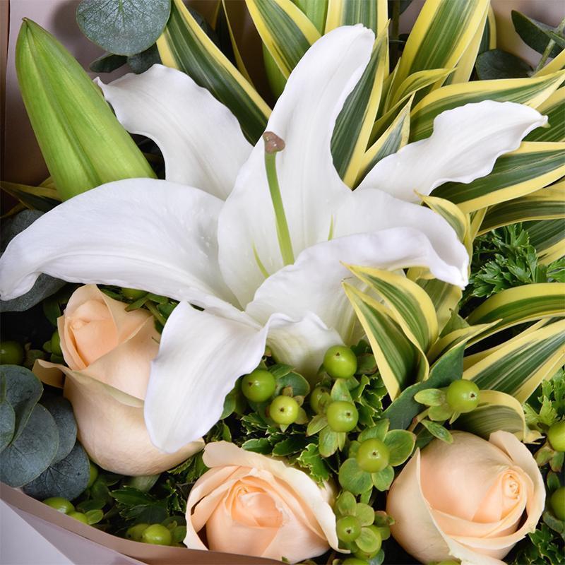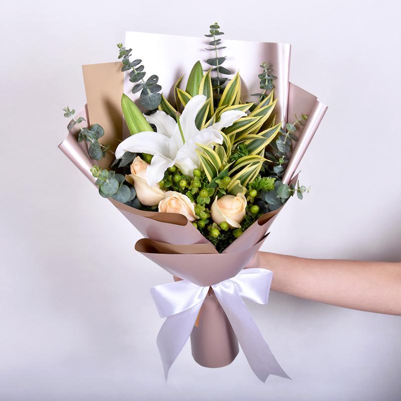 White Lily (1 Stalk), Champagne Rose (3 Stalks), Green Berry (2 Stalks), Eucalyptus Leaves, Green Song of India