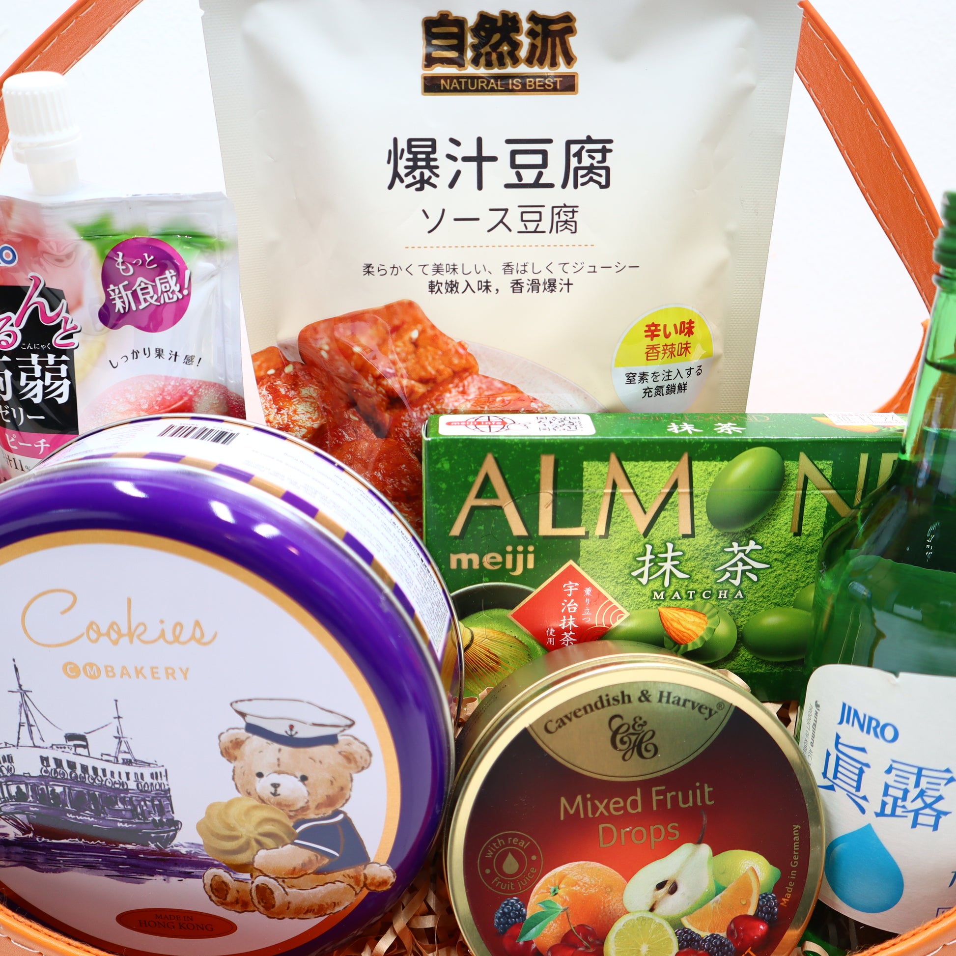 Delight your loved one with our sweet and savory hamper. Enjoy Jinro Chamisul Fresh, Magical Bakery Butter Cookies, Naturalisbest Fried Tofu, Orihiro Peach Jelly, Meiji Almond Matcha Chocolate, and Cavendish Mixed Fruit Drops. The perfect gift to show you care!