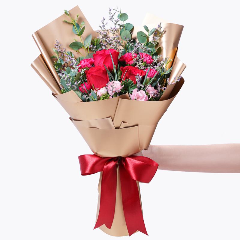 Red Roses (3 Stalks), Light Pink Carnation (3 Stalks), Shocking Pink Carnation Spray (1 Stalk), Purple Caspia, Eucalyptus Leaves