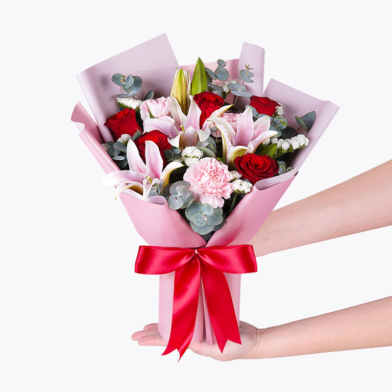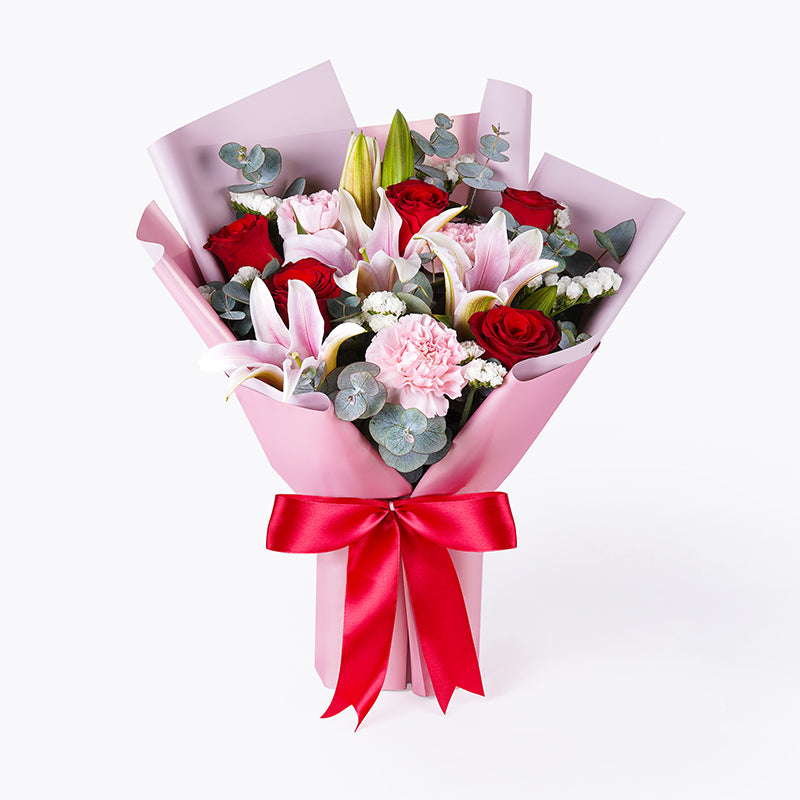 Pink Lily (2 Stalks), Red Roses (5 Stalks), Pink Carnation (3 Stalks), White Statice (2 Stalks), Eucalyptus Leaves