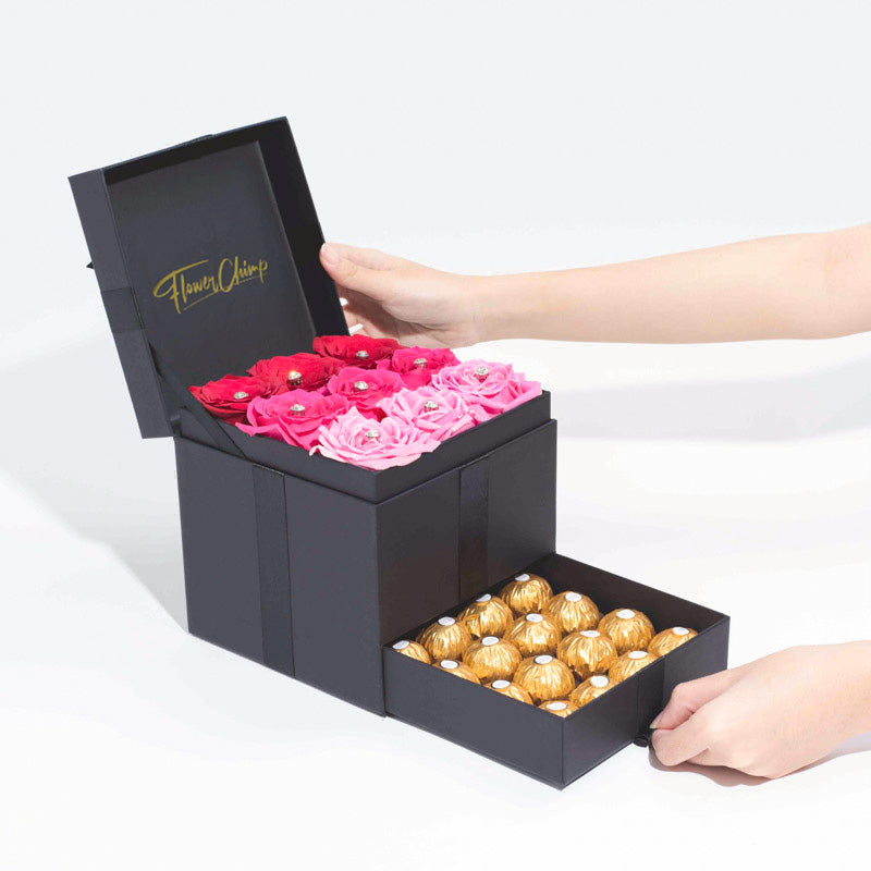 A treasure trove of timeless romance, passion and a little bit of magic; presented elegantly in a box of fresh roses and chocolates –fit for that burning love of your life.