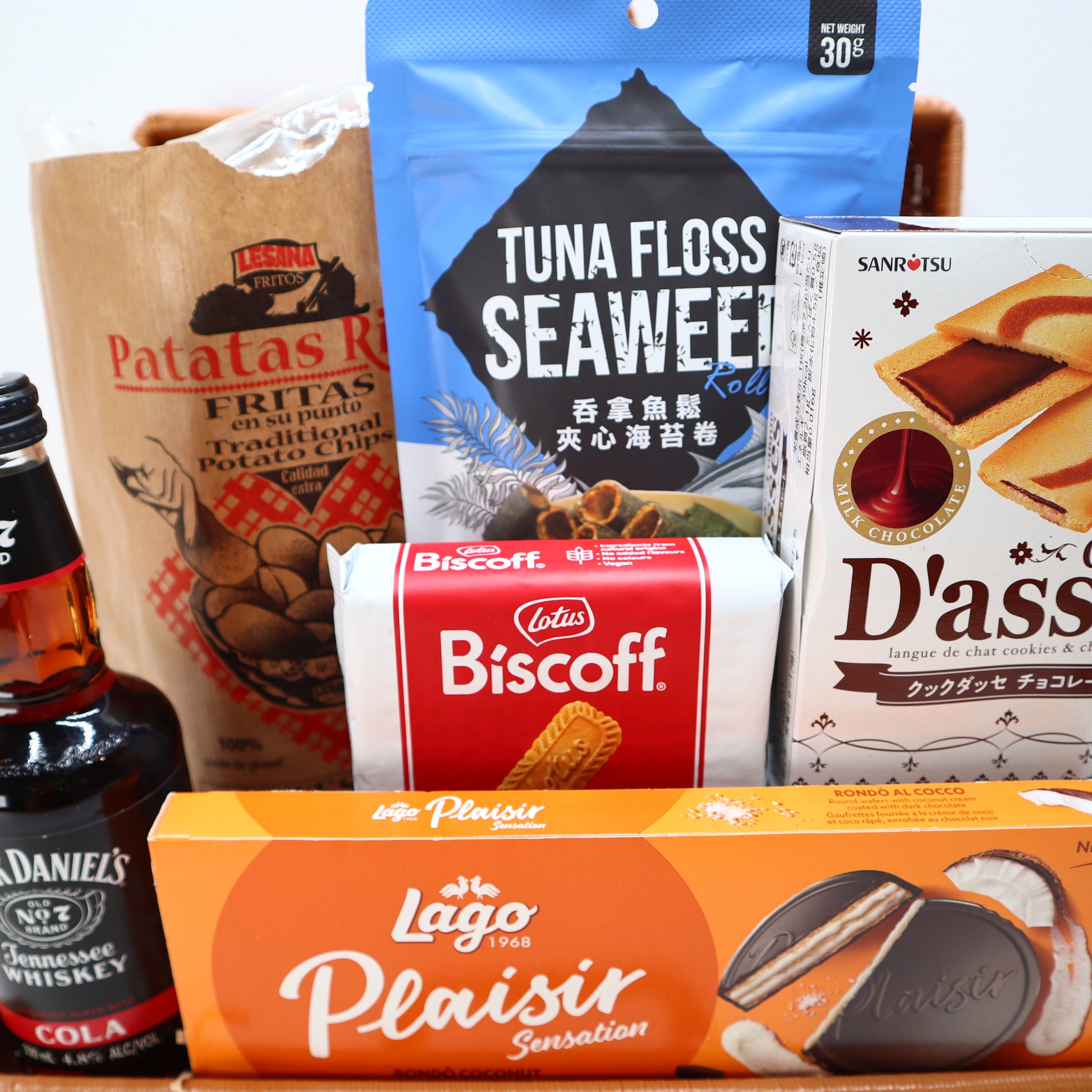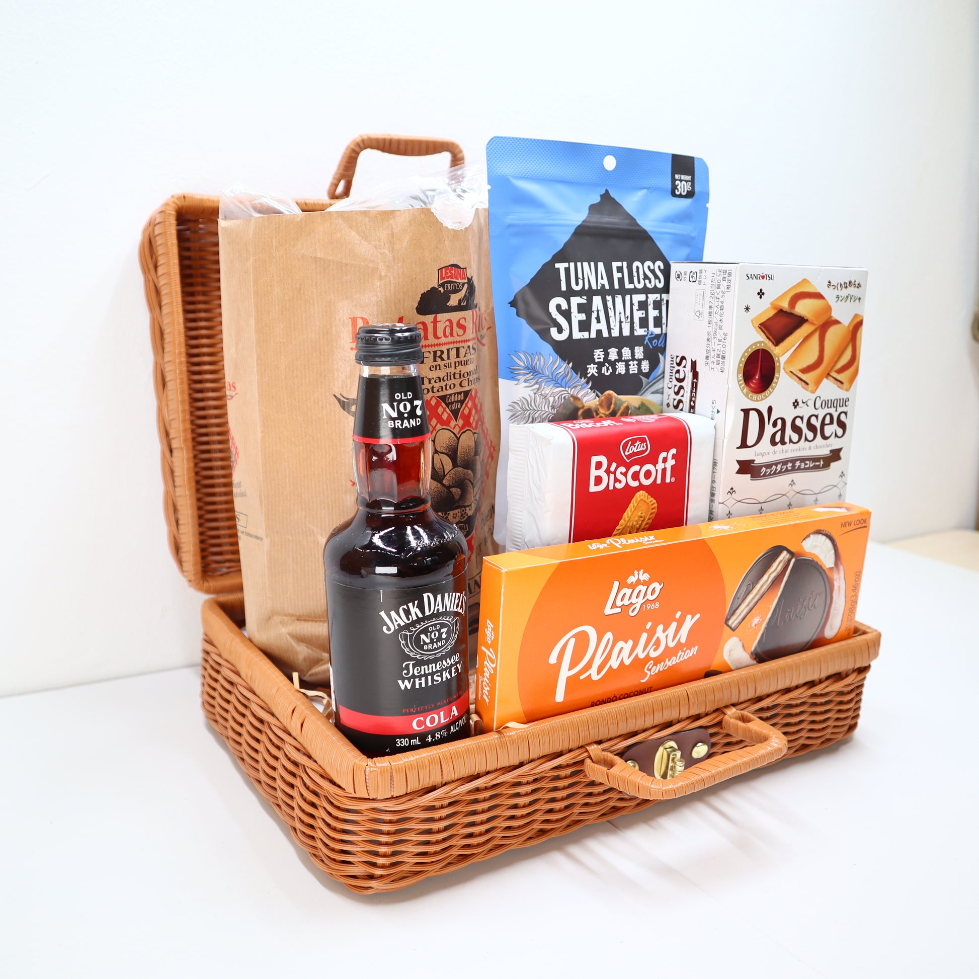 Show your appreciation with this thoughtful gift. Enjoy Jack Daniel's Whiskey & Cola, Gastone Lago Plaisir Wafer Filled, Sanritsu D'asses Chocolate Cookies, Lotus Caramelised Biscuit, Gancedo Traditional Chips, and Tuna Floss Seaweed.
