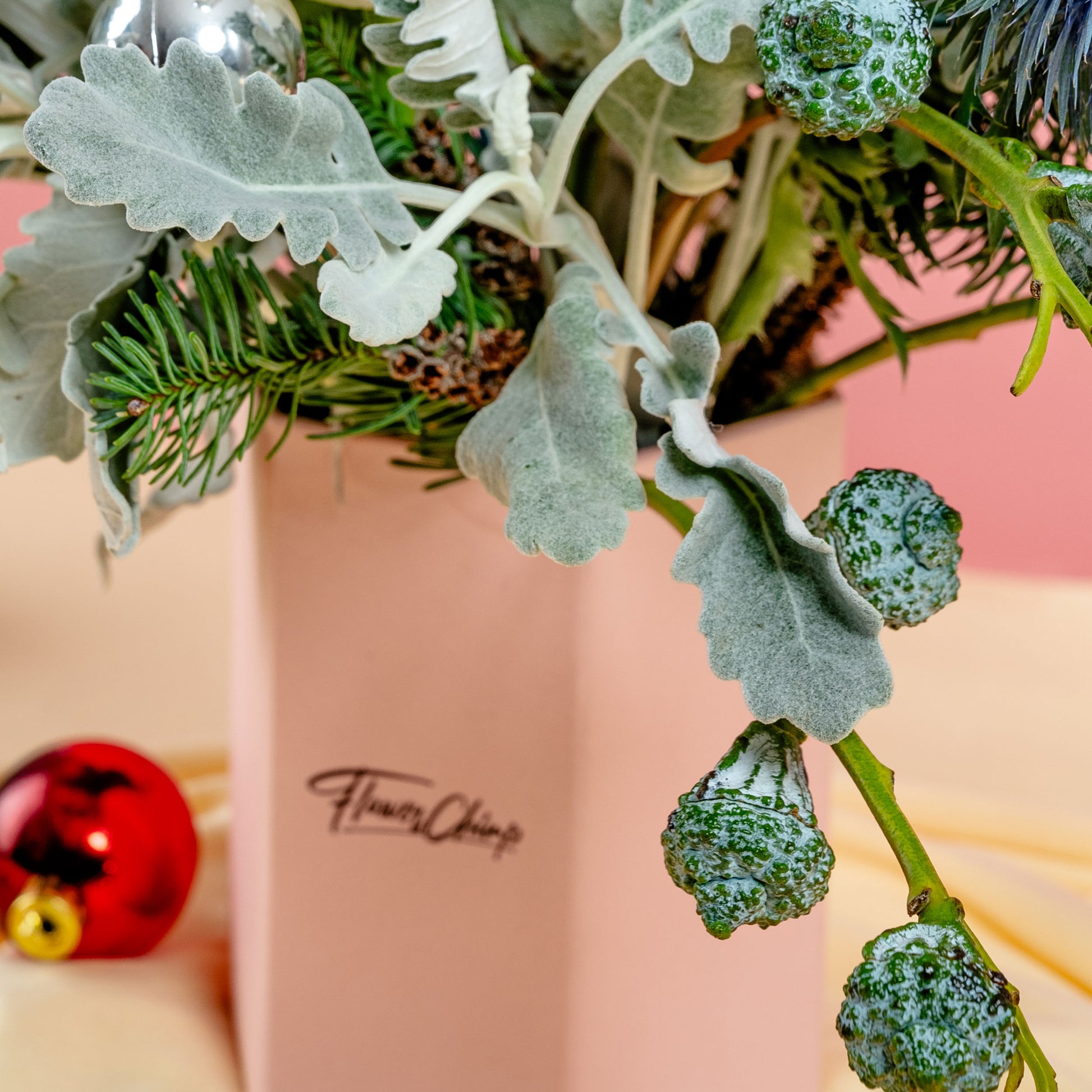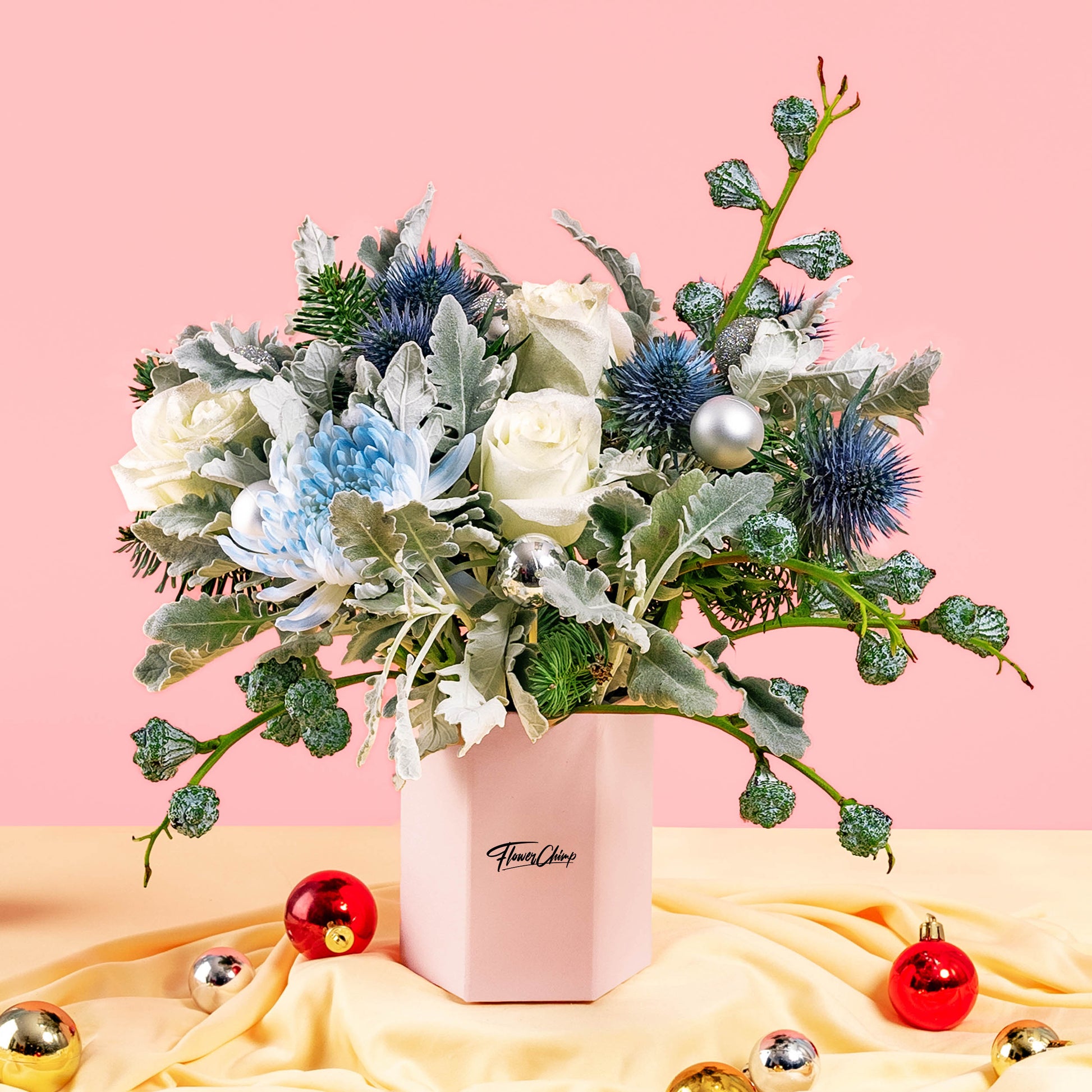 Embrace the chill of the season with our Winter Frost Flower Box. Elegant white roses and blue eryngium come together in this frozen-themed arrangement, perfect for adding a touch of winter’s magic to any room.
