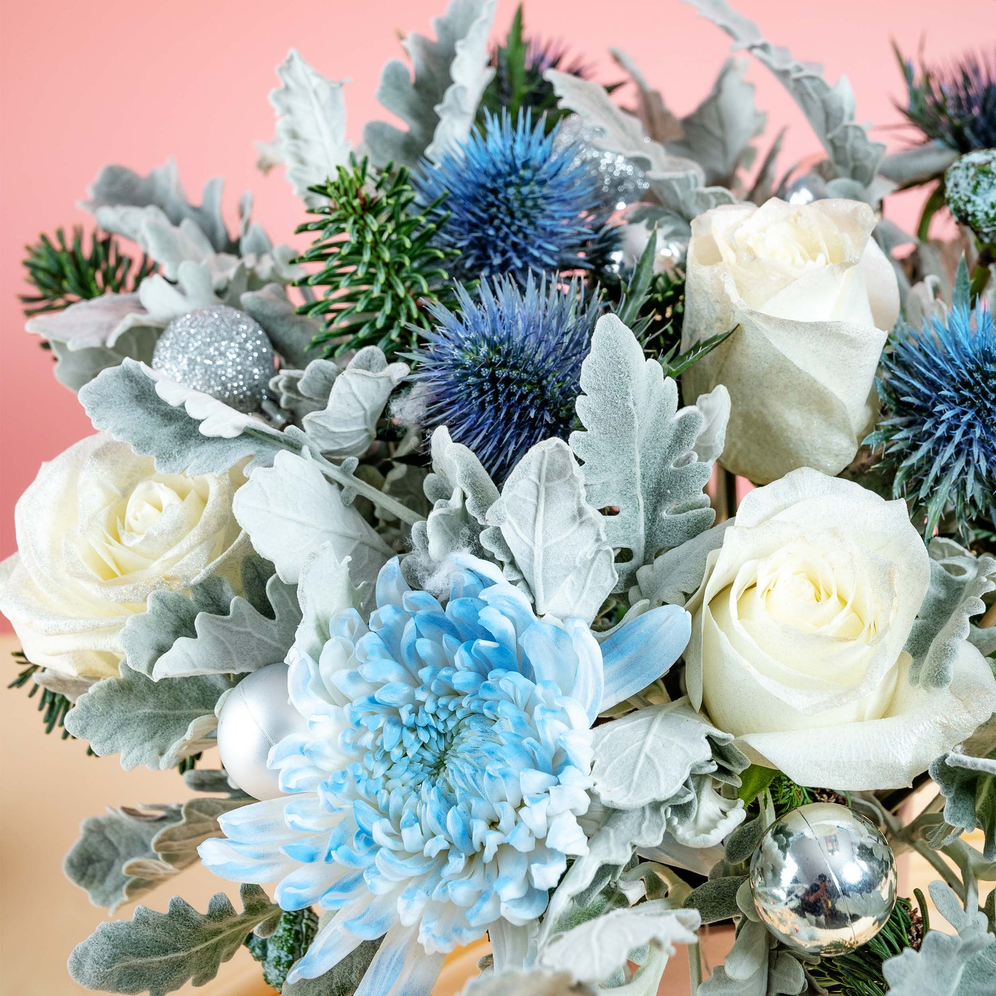 White Spider Mum (1 Stalk), White Rose (3 Stalks), Blue Eryngium (1 Stalk), Dusty Miller (1 Stalk), Silver Kochai (1 Stalk), Silver Eucalyptus Nut, Nobilis Fir